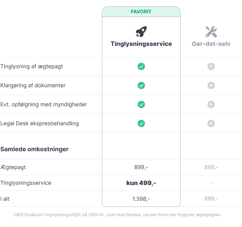 Det er altid et krav, at en ægtepagt tinglyses for at blive gyldig. I kan vælge selv at sørge for tinglysning af ægtepagt ved at følge denne vejledning - eller I kan vælge at lade os sørge for det. Uanset hvem der foretager tinglysningen, skal der betales et gebyr til det offentlige på 1.850 kr. (2025).