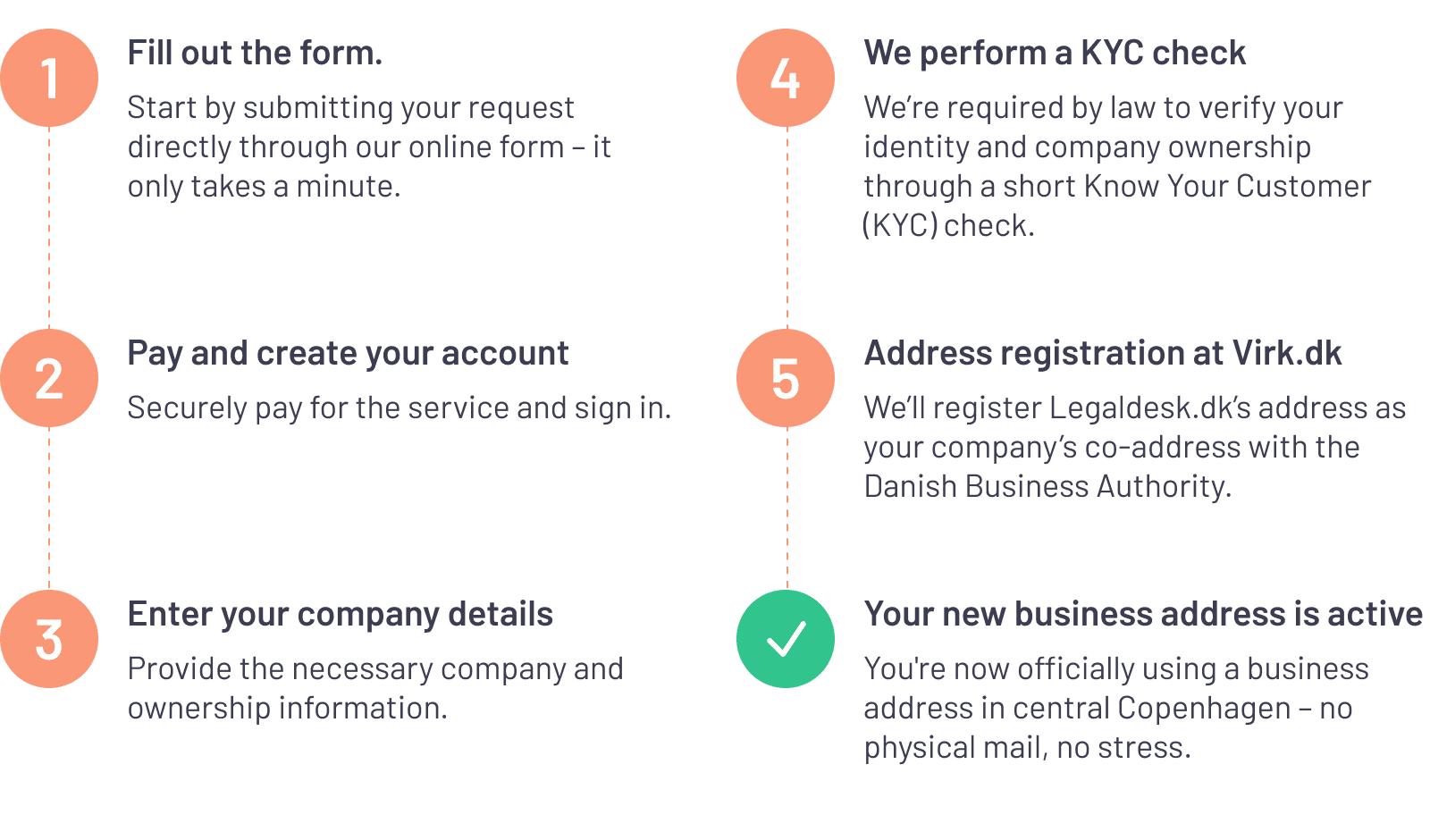 When you start a business through Legal Desk, you can immediately opt for a virtual office. We will register the address with the Danish Business Authority as part of the setup.