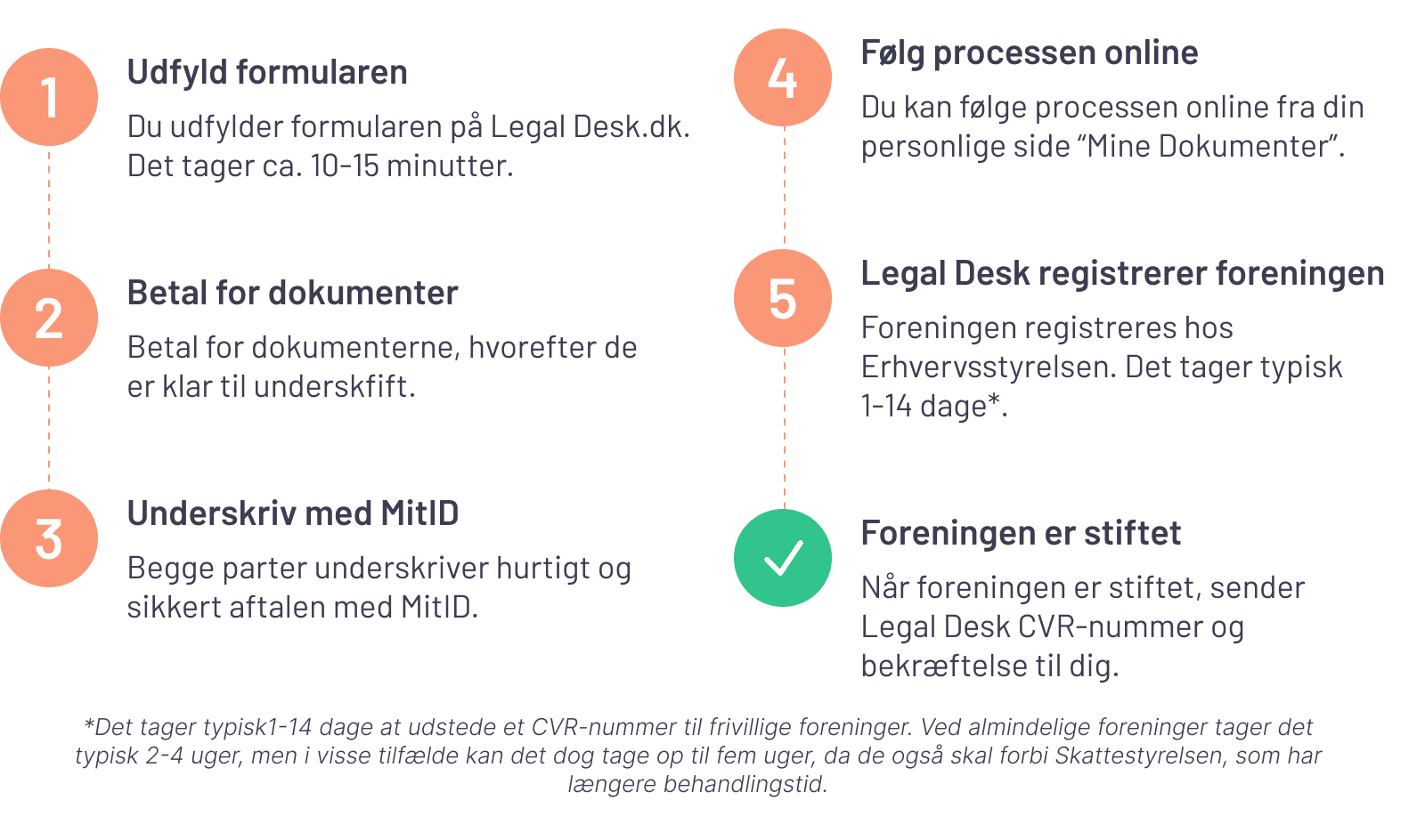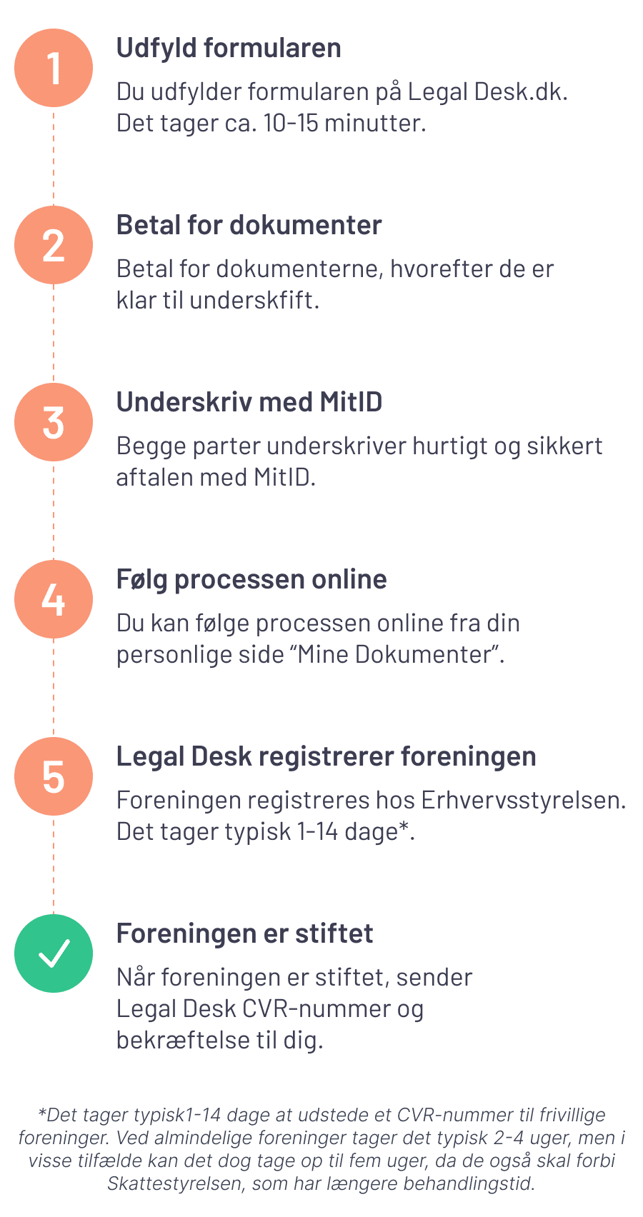 For at oprette din forening med Legal Desk, skal du blot udfylde vores formular. På baggrund af dine svar vil foreningens vedtægter og generalforsamlingsreferat blive udarbejdet, så de er skræddersyet til jeres behov.
