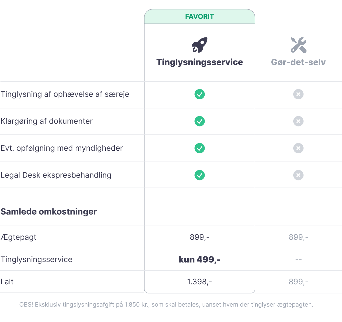 Når I har gennemført formularen og købt jeres ægtepagt om ophævelse af særeje, modtager I den med det samme. Herefter skal den dateres og underskrives af begge ægtefæller. Vær opmærksom på, at ægtepagten skal tinglyses for at opnå gyldighed. I kan bestille Legal Desk tinglysningsservice i forbindelse med, at I udfylder formularen og dermed lade os ordne tinglysningen for jer. Uanset hvem der tinglyser ægtepagten, skal der betales en tinglysningsafgift til det offentlige på 1.850 kr.