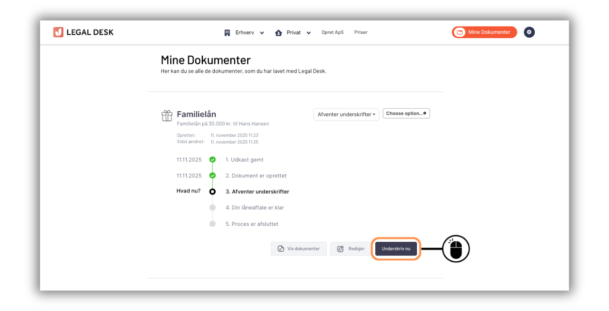 På tidslinjen vil det fremgå, hvornår du skal underskrive. Klik nu på “Underskriv nu”.