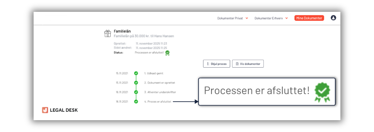 Herefter kan du trygt og sikkert opbevare dine dokumenter på din Legal Desk konto. På den måde kan du altid få adgang til dem og slippe for at printe og holde styr på en masse dokumenter.