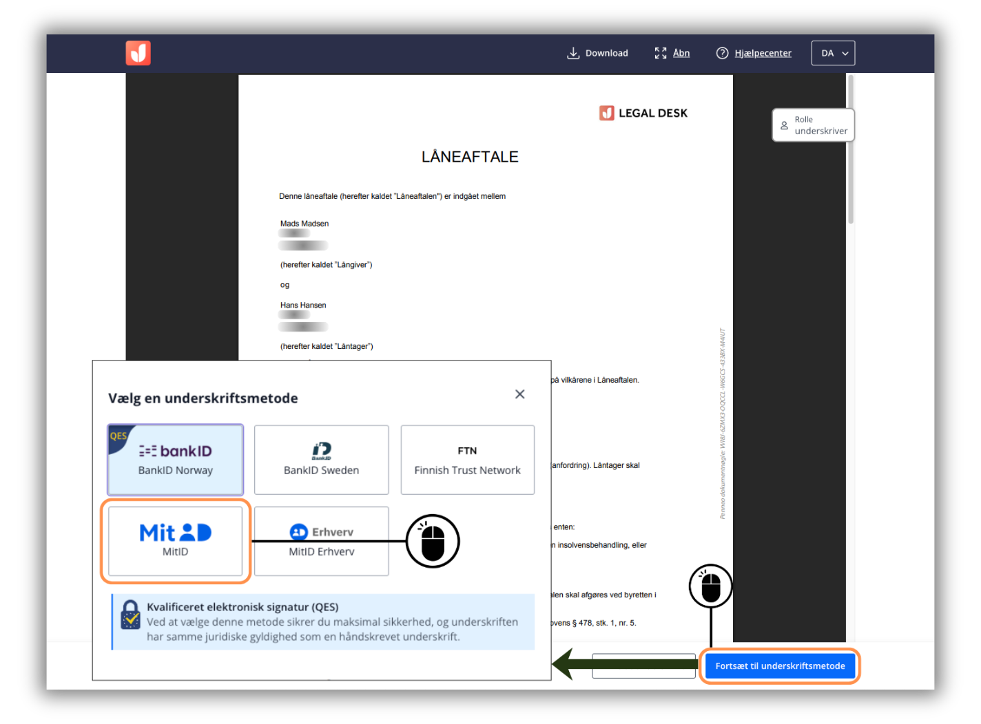 Når du er færdig med at læse dokumentet igennem, klikker du på “Fortsæt til underskriftsmetode” og vælger MitID.