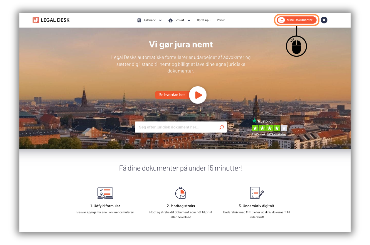 Når du har købt dit dokument, vil det altid ligge under “Mine dokumenter”, som du finder i menuen, når du er logget ind.