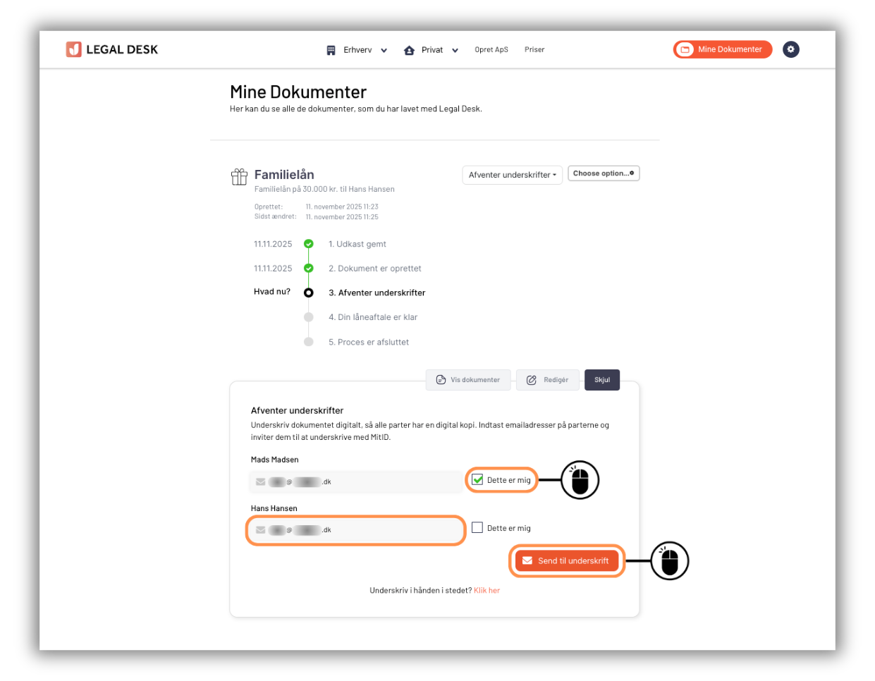 Hos Legal Desk kan du nemt og sikkert underskrive dine juridiske dokumenter med MitID. Det gælder også, hvis dokumentet vedrører flere parter. Denne vejledning forklarer, hvordan du selv underskriver med dit MitID, og hvordan du sender dokumentet videre til andre, der skal underskrive med deres MitID.