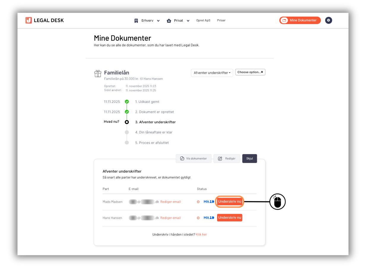 Ud for de øvrige personers navne vil der stå “Afventer underskrift”, indtil de har underskrevet.